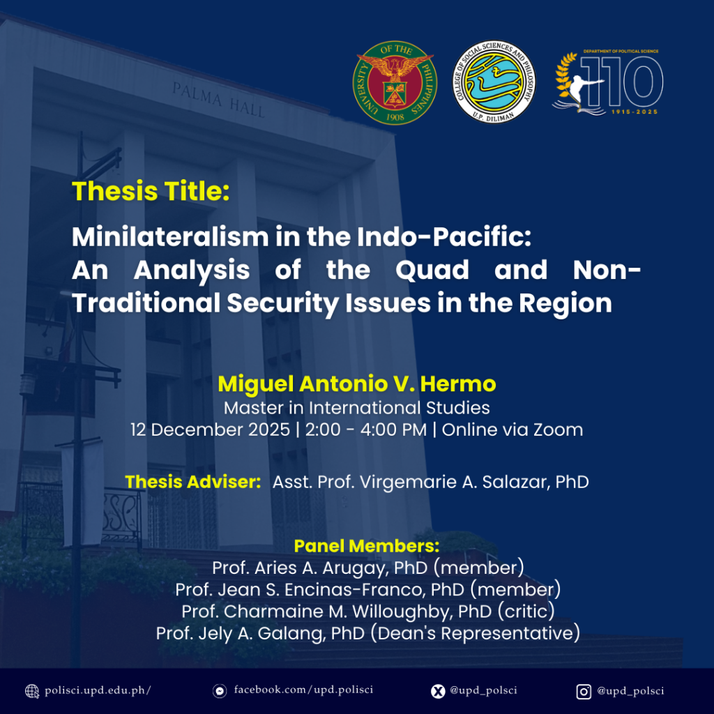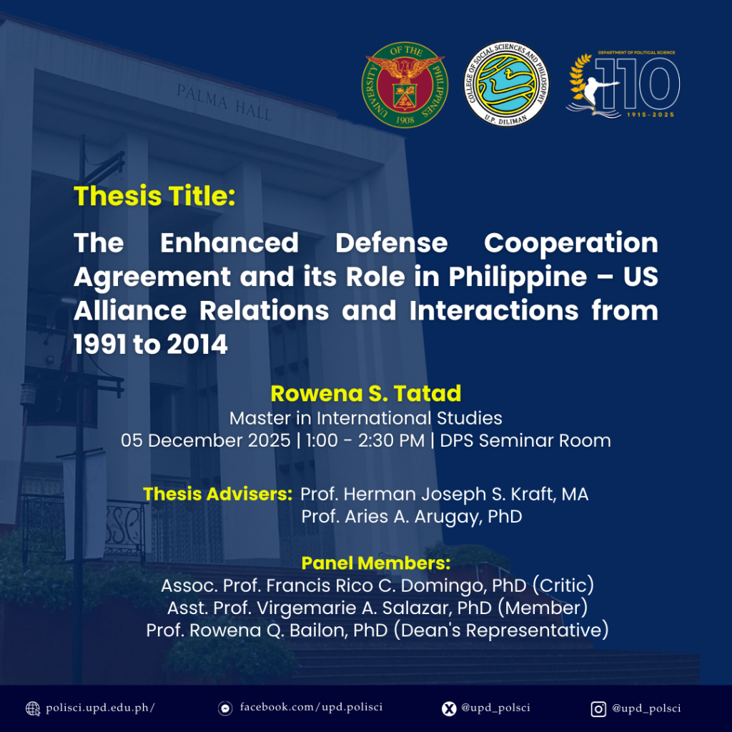 The UP Department of Political Science is pleased to announce the schedule of thesis final defenses for the Master of Arts (Political Science) and Master in International Studies programs.
